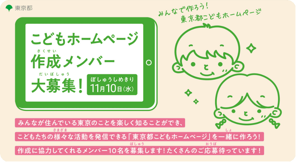 令和3年(2021年)10月にこどもホームページ作成メンバーを募集。たくさんの応募の中から都内の小学生10名が決まったよ。
