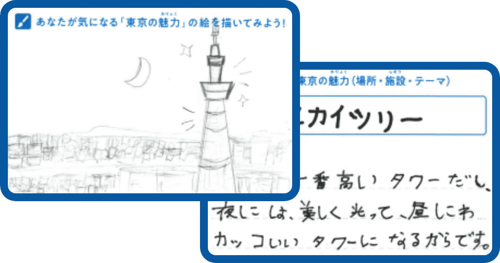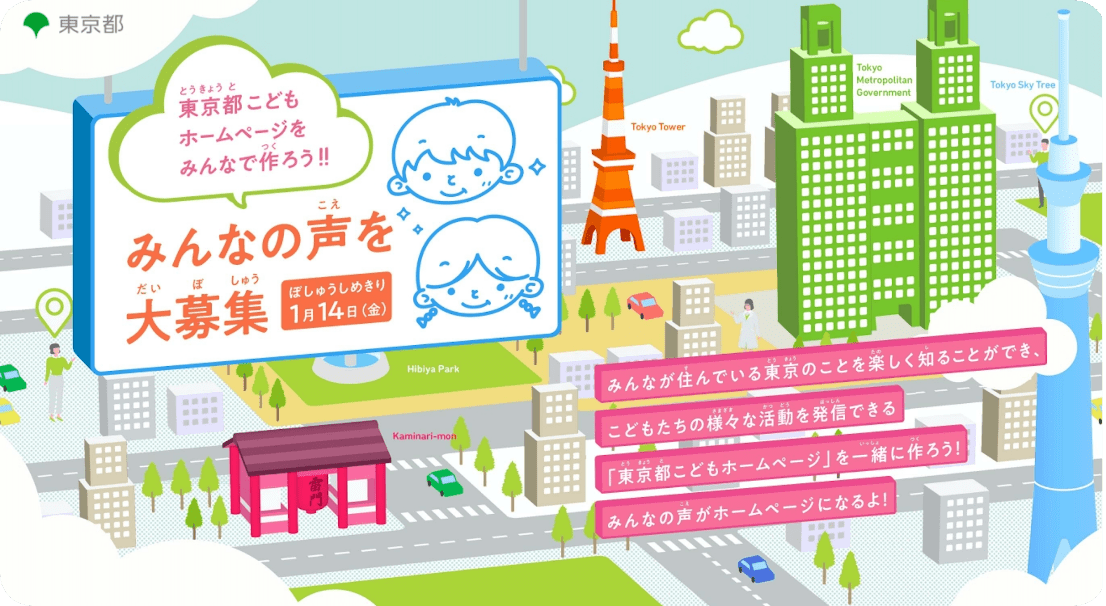 みんなの意見やアイデアから、「バーチャル社会科見学」「東京の魅力すごろく」「発見!東京都の仕事」「やってみよう!こども新聞・地域マップ」などのコンテンツは生まれたんだ。