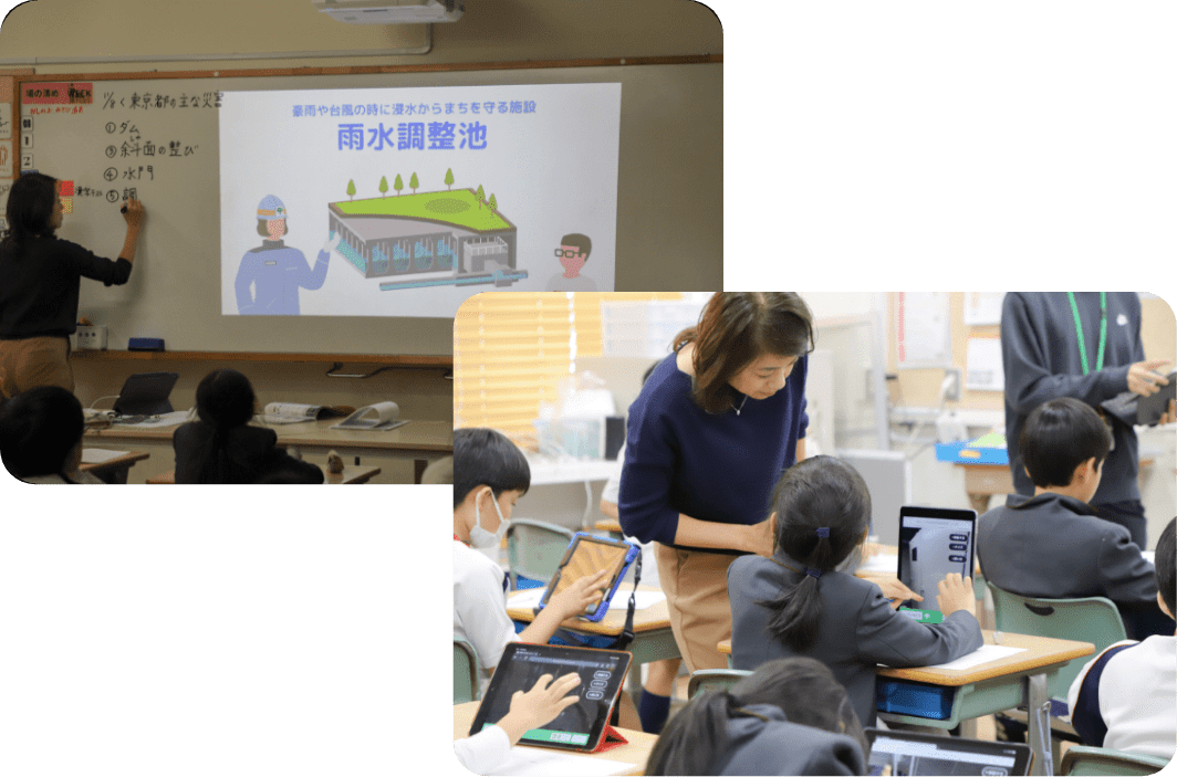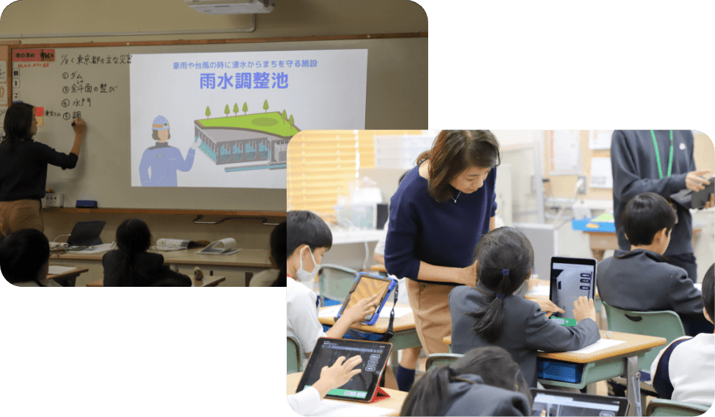 いずみの森義務教育学校4年生の社会科の授業で「バーチャル社会科見学」の「東池袋雨水調整池」を、ワークシートを使いながら学びを深めました。