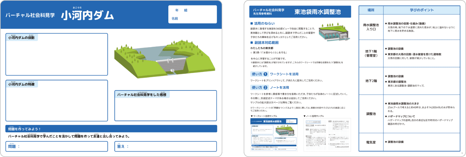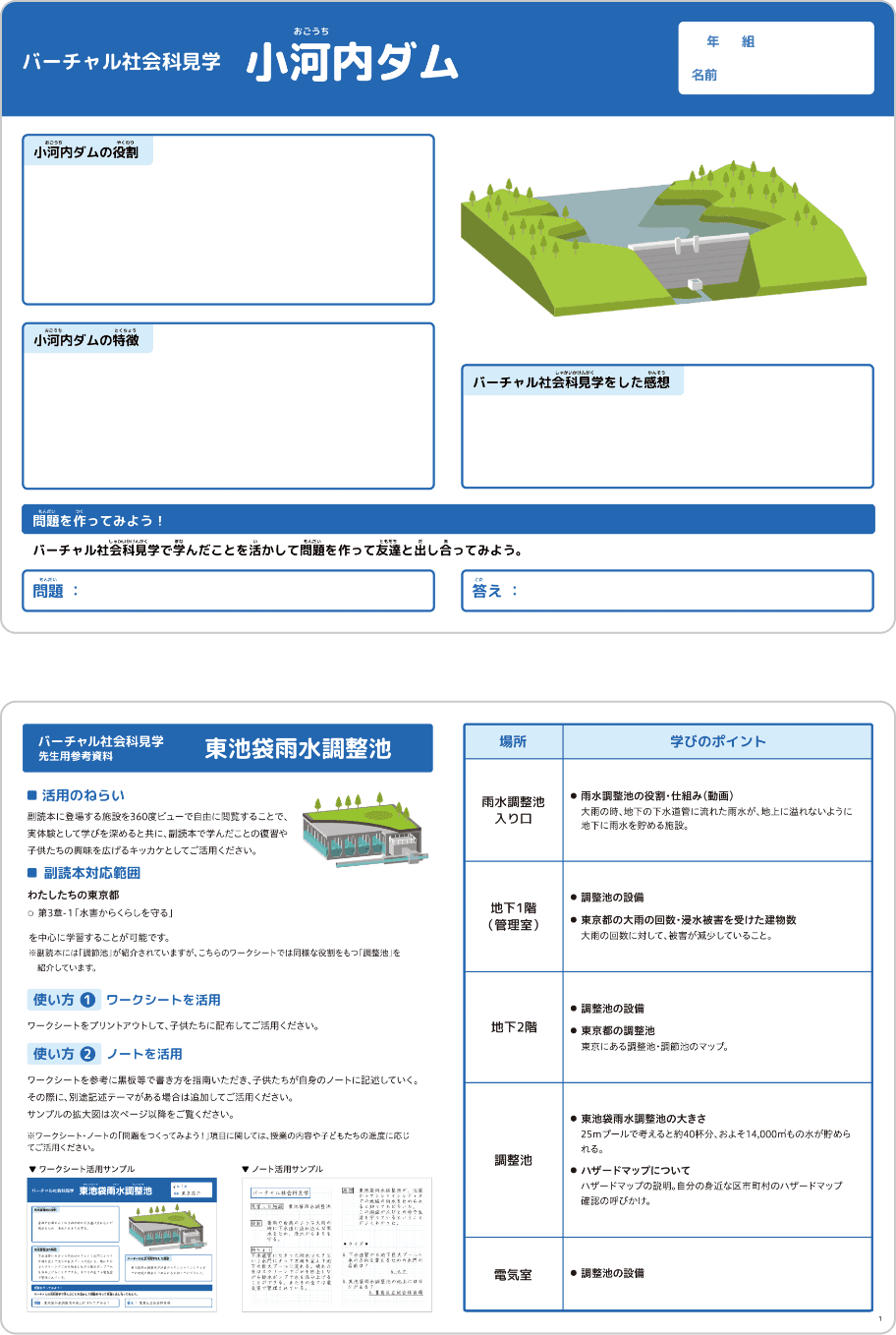 バーチャル社会科見学の「小河内ダム」と「東池袋雨水調整池」のワークシートを作成したよ。