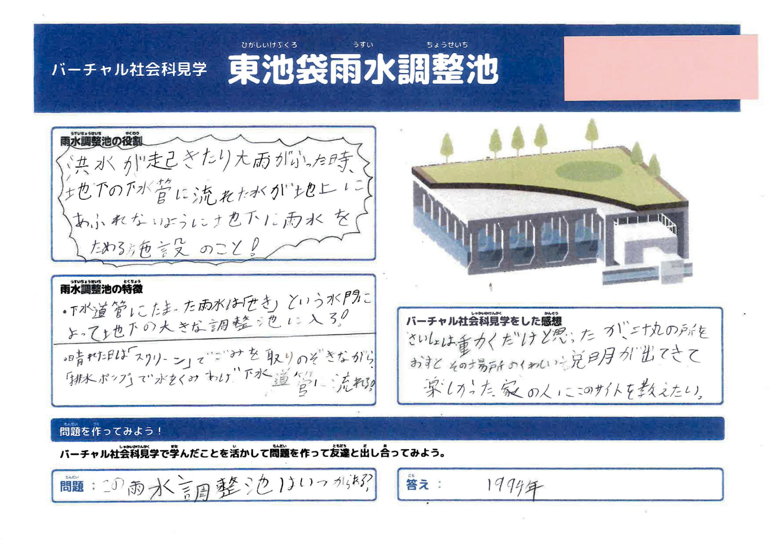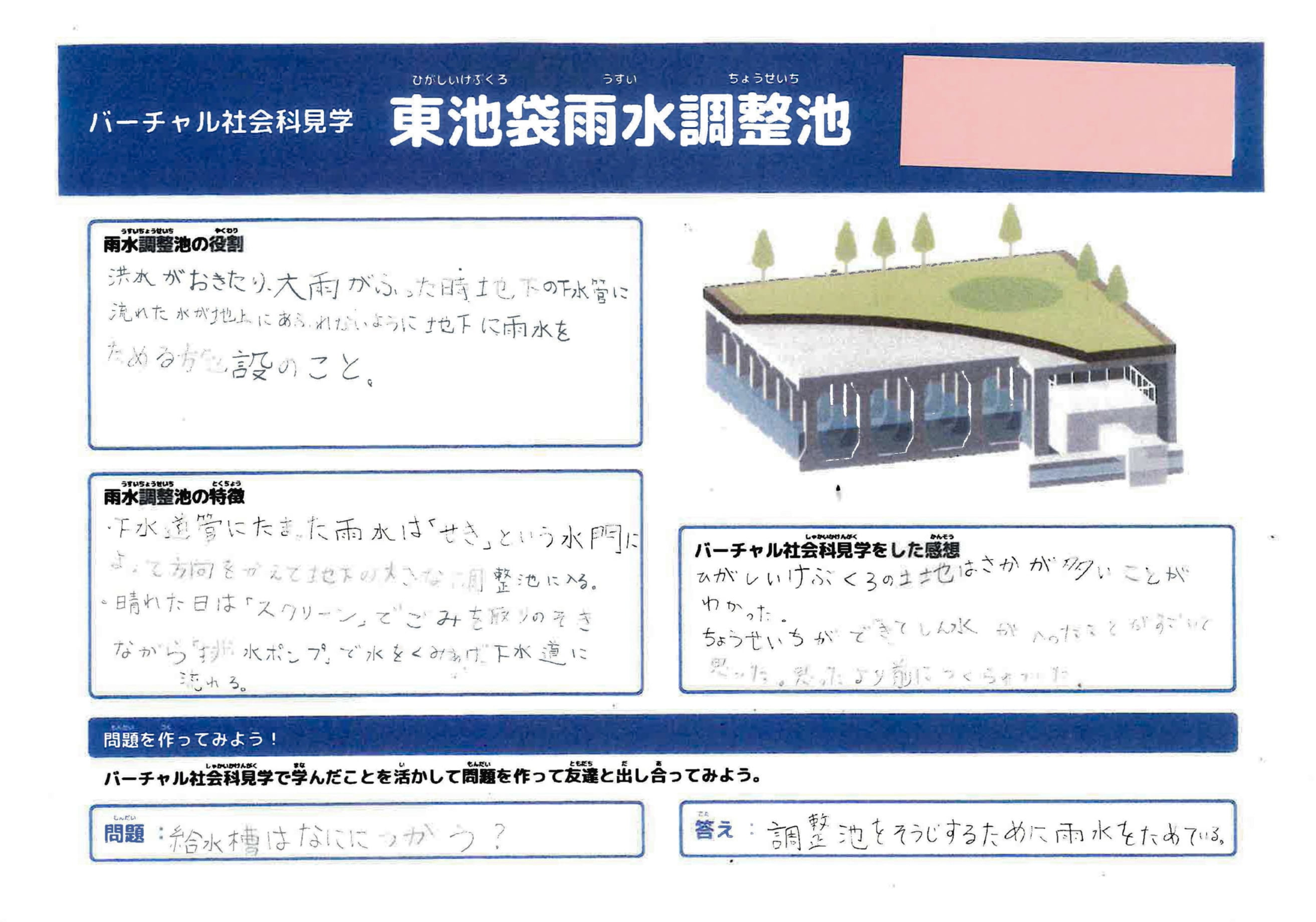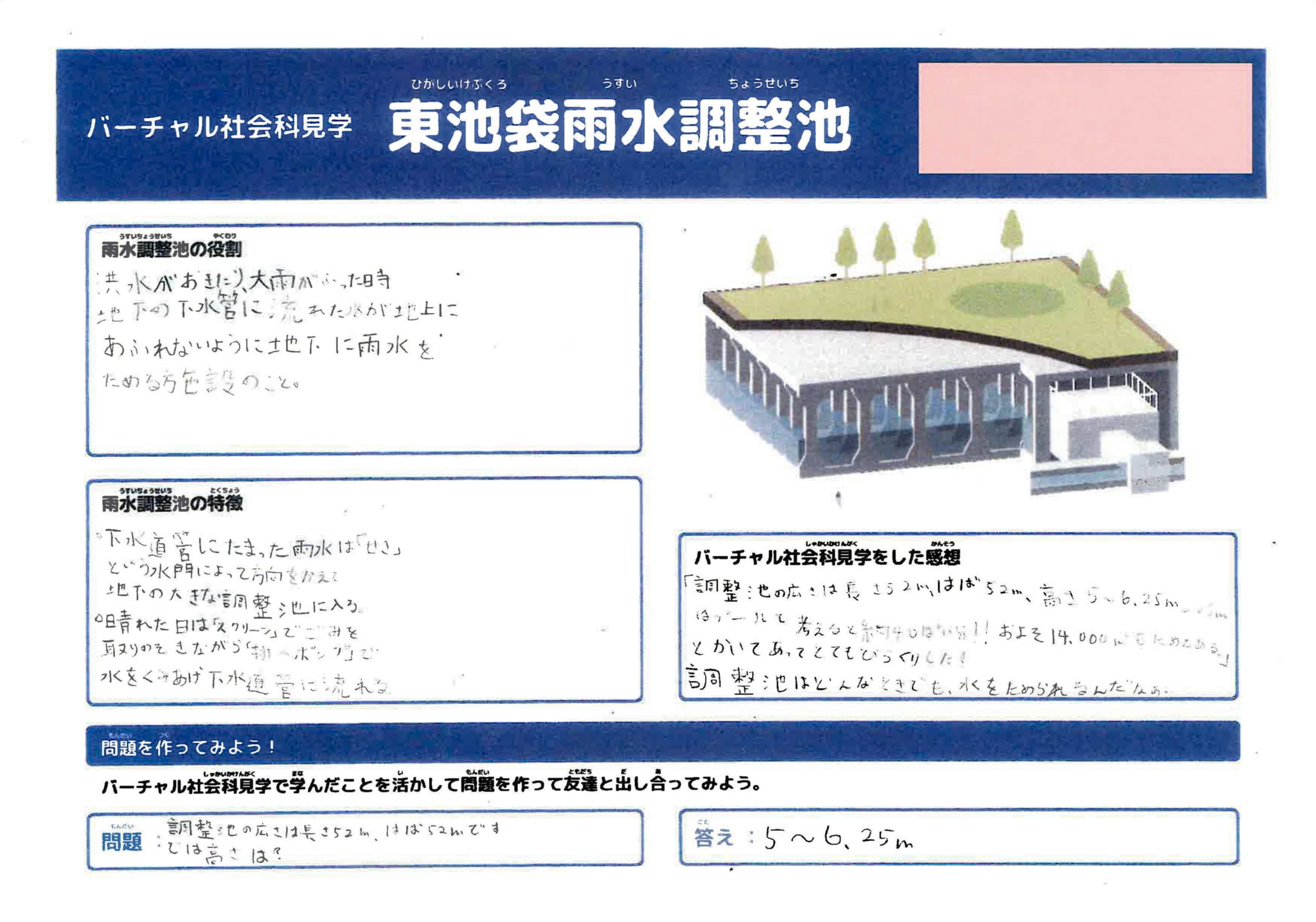 新渡戸文化小学校4年生の社会科の授業でバーチャル社会科見学の「東池袋雨水調整池」を、ワークシートを使いながら学びを深めました。