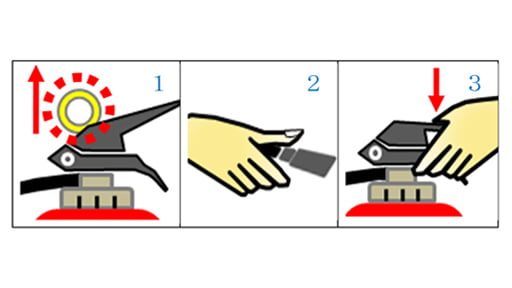 - まず黄色いピンを抜き、次にホースの先を燃えているものに向けて、最後にレバーを握ります。消火器を運びながらこの動作を行うことはとても危ないので、必ず、消火器を使う場所まで運んでから、この動作を行います。