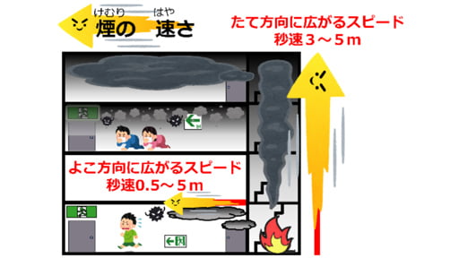 - 煙は階段などを伝わって、速いスピードで上の方に広がっていきます。階段など、たての空間を上がっていくスピードは1秒に3~5mで、廊下など、横への空間に広がっていくスピードは1秒間に約50cm~5mです。