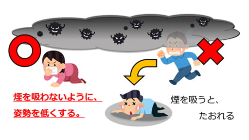 - 火事で亡くなる人の多くは、煙を吸い込んでしまい、避難できなくなってしまった事が原因です。煙には、有毒なガスが多く含まれており、1回か2回吸い込むだけでも危険です。煙を吸わないように、姿勢を低くして避難するようにしましょう。
