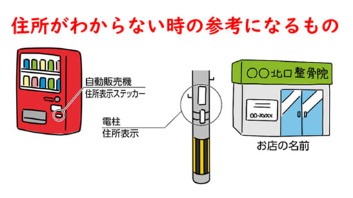 また、通報の際には消防隊が向かう住所について聞かれますが、もし住所がわからない時は、建物の名称や近くの目印となるものを伝えてください。